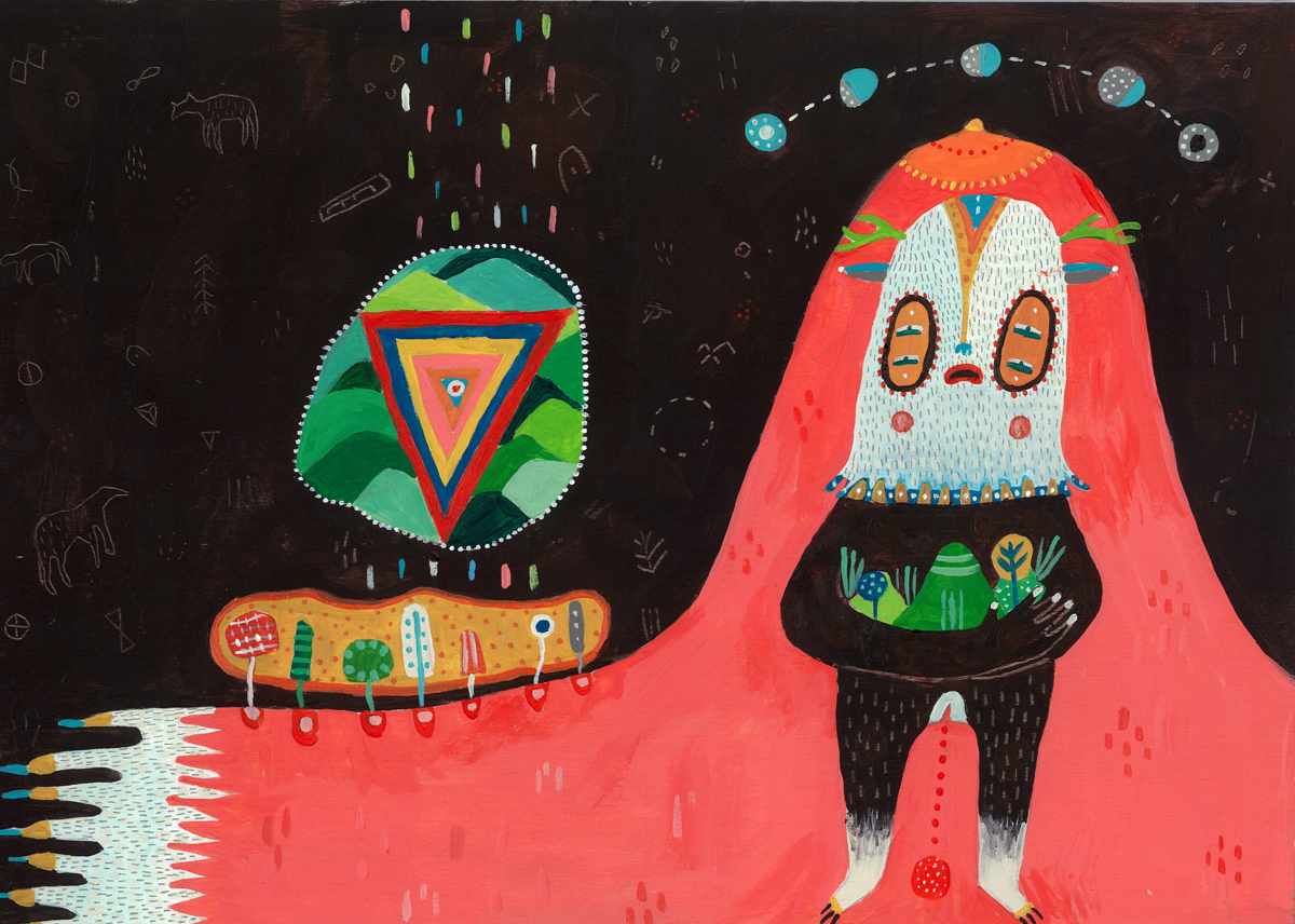 Sus gestaciones son errores bonitos, monstruos salvajes, acumulaciones de pelos, son bestias desobedientes, jaurías de animales delirantes, cuerpos caóticos y especies híbridas. Dibuja todas esas cosas que habitan entre los espacios donde se rozan los mundos.